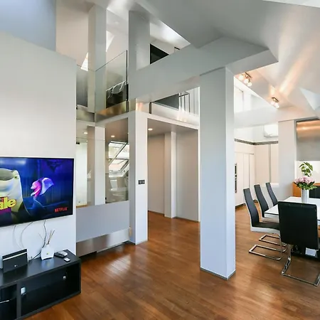 位于布拉格10地区的Luxury Central Duplex With Terrace公寓提供城市风景. 公寓设有厨房,阳台单独的公用的开放式内装的">和私人私人浴室.